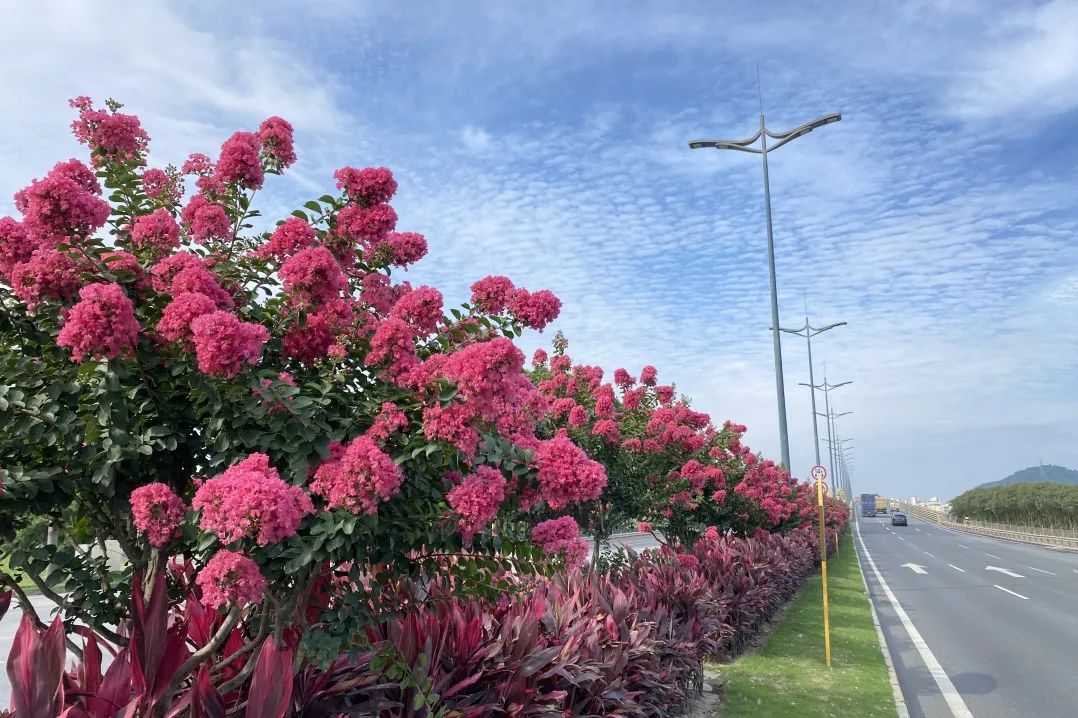 珠海农控集团下属粤华园林公司作为珠海大道的专业养护单位,精心种植了小叶紫薇、大叶紫薇与蟛蜞菊成为城市道路景观的点睛之笔,为市民和游客献上了一场夏日花廊的视觉盛宴。