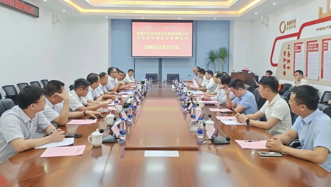 2021年10月8日下午,珠海农控集团与华侨城华南集团战略合作框架协议签约仪式在农控物流园举行。珠海农控集团张凡董事长、华侨城华南集团杨云飞总经理出席见证并致辞,珠海农控集团副总经理肖军,华侨城珠海项目筹建组组长赖冠宇分别代表双方签订《战略合作框架协议》。