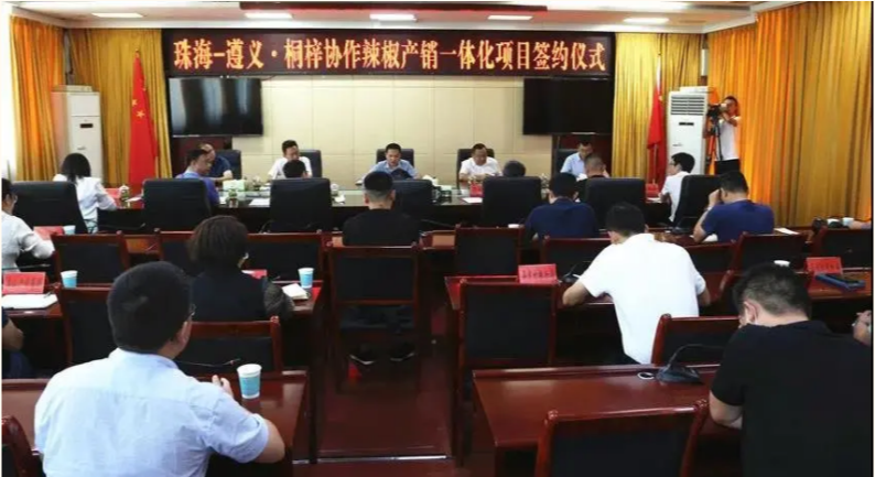 近日,“珠海-遵义· 桐梓协作辣椒产销一体化项目”签约仪式在桐梓县政府举行。桐梓县人民政府、珠海市菜篮子投资有限公司、辣妹子食品股份有限公司、遵义辣椒产业集团有限公司签订了四方合作协议,共同打造辣椒产销一体化产业。珠海农控集团党委副书记刘国涛同志出席签约仪式。